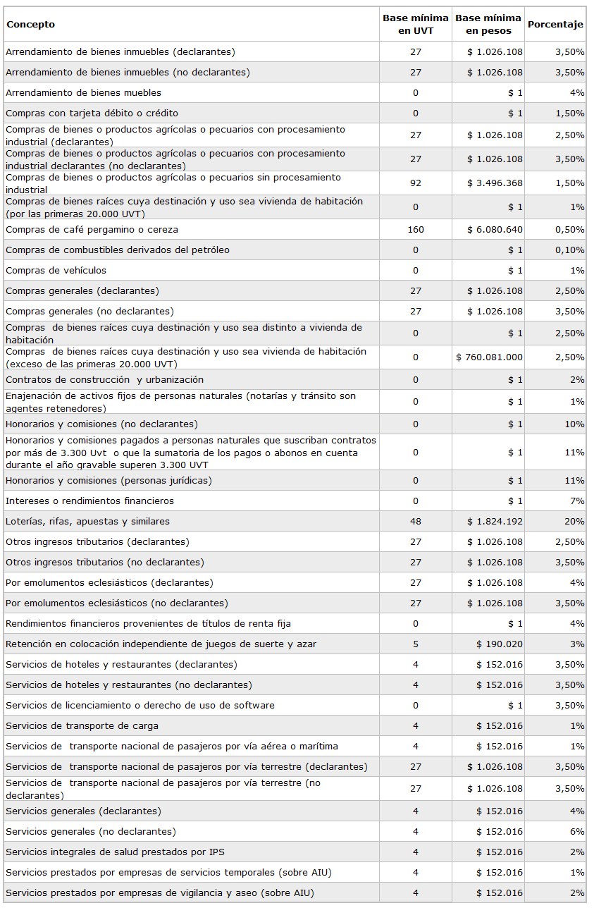 Hola comunidad!! les comparto la tabla de retención en la fuente con las bases y tarifas que regirán en Colombia en la vigencia 2022 para la cual, la Dirección de Impuestos y Aduanas Nacionales (DIAN) fijó el valor de la UVT en $38.004.